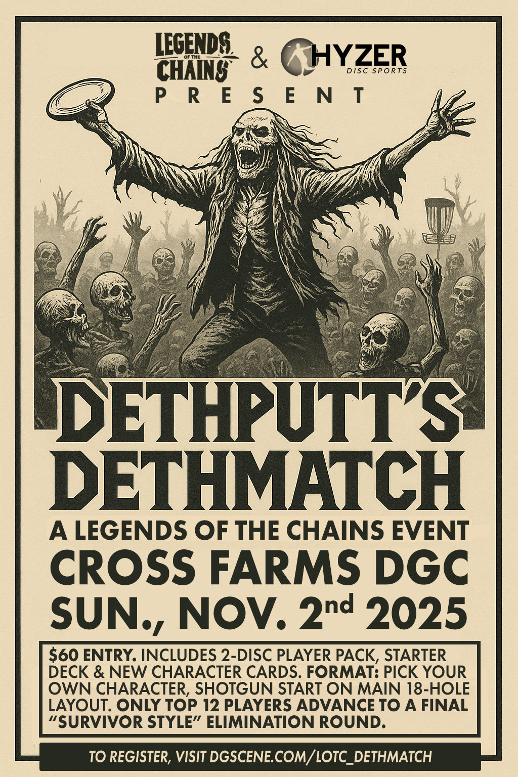 Cursed by the Disc Gods, the death-metal rock star known as Dethputt has clawed his way out of the graveyard to challenge YOU to compete in an epic Legends of the Chains tournament. Will you rise to the top or be buried in bogeys?